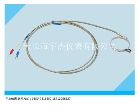 抱箍式热电偶、热电阻是将测量端焊接在直径能收缩的抱箍上,然后安装在被测管道的外面,通过抱箍的集热就可测量管道表面温度。该产品安装方便、结构简单、热响应时间快、测量可靠且价格低廉。