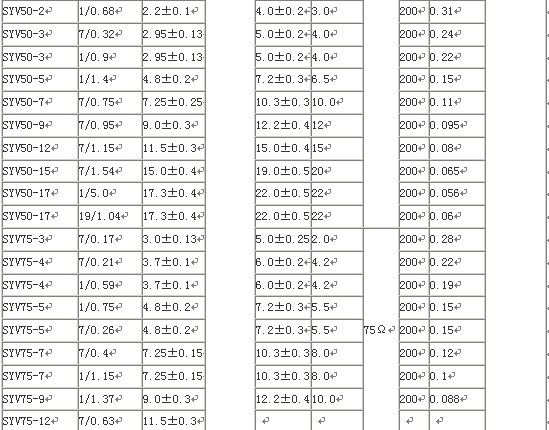 1:执行标准:GB/T14864-93 2:产品型号:SYV 3:导体裸铜 4:绝缘为实心聚乙烯 5:裸铜丝、镀锌铜丝、铜包铝、铜丝编织屏蔽 6:聚氯乙烯外护套 适用于无线电通信和采用类似技术的电子装置