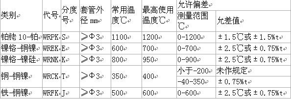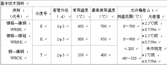 安徽维尔特铠装热电偶的基本技术指标
